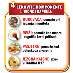 Sadržaj: Jedna želatinasta kapsula sadrži 400mg smese B17 APRICARC – prašak od jezgra kajsija, prašak sušenog ploda pasjeg trna (Hippophae rhamnoides), prašak liofilizovane REIŠI (Ganoderma lucidum), prašak bukovače (Pleurotus ostreatus) i ulje od jezgra kajsija bez primesa.