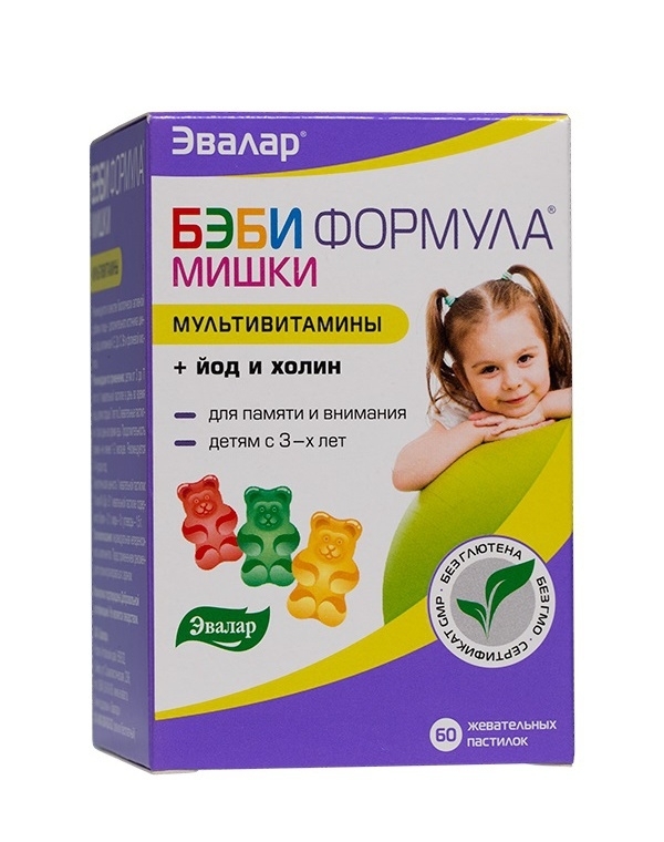 Sirup glukoze, šećer, želatin, koncentrovani sok od jabuke, kukuruzni skrob, askorbinska kiselina, alfa tokoferol acetat, folna kiselina, cink citrat, limunska kiselina (regulator kiselosti) prirodni aromatizatori „Narandža“, „Jagoda“, „Grožde“, suncokretovo ulje, retinol acetat, natrijum citrat i jabučna kiselina (regulatori kiselosti), biotin, piridoksin hidrohlorid, rotkvica crvena (prirodna boja), holekalciferol, beta karoten i karamel boja (prirodni aditivi za boju), cianokobalamin, kalijum jodid, holin bitartrat, inozid.